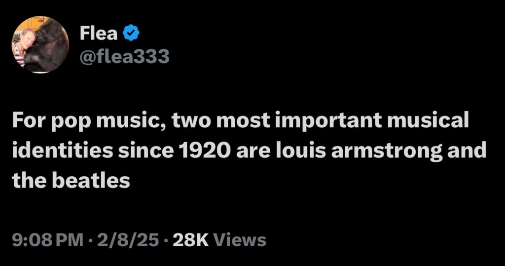 The landscape of popular music is vast and expansive. Given these parameters, along with the highly subjective nature of music interpretation, labels and designations in terms of musical importance are bound to vary endlessly among dedicated listeners and students of the craft. But in considering potential candidates for the two most important musical identities in pop (popular music) over the past 105 years, there are certainly worse possible selections than one-two-punch of jazz and rock/pop revolutionaries Louis Armstrong and The Beatles recently put forth by Flea.