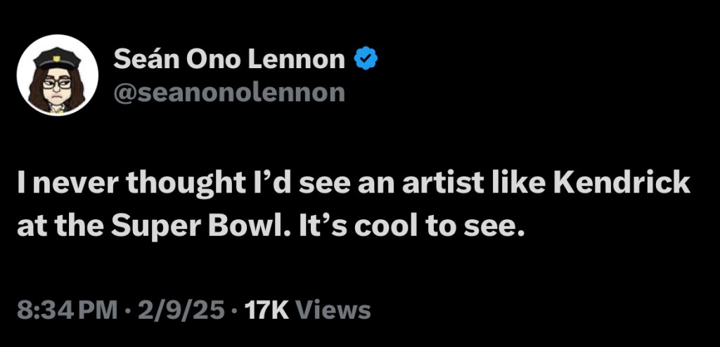 “I never thought I’d see an artist like Kendrick at the Super Bowl,” said Lennon via the social media platform, X. “It’s cool to see.”