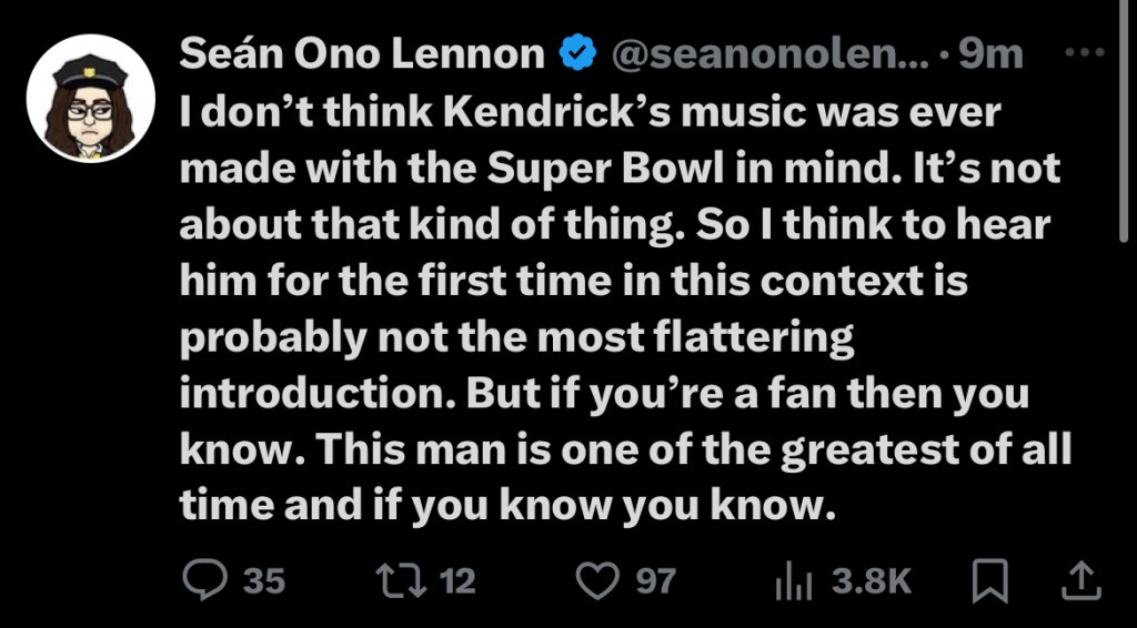 ”I don’t think Kendrick’s music was ever made with the Super Bowl in mind. It’s not about that kind of thing,” Lennon continued in a follow-up post. “So I think to hear him for the first time in this context is probably not the most flattering introduction.”