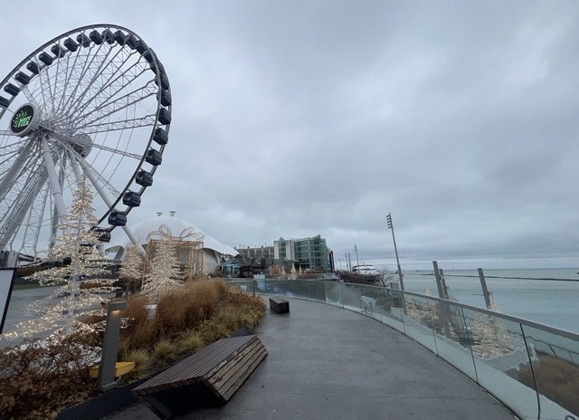 The Navy Pier is a 33,000 ft long pier on Lake Michigan. It’s Chicago’s second-most-visited attraction, which has shops, restaurants, family attractions, parks, gardens, and more. At the top of the pier is a small amusement park featuring the iconic Navy Pier Wheel. The pier is also home to many events and seasonal festivals. It was New Year’s Eve, so the winter festivities were closed for the day.