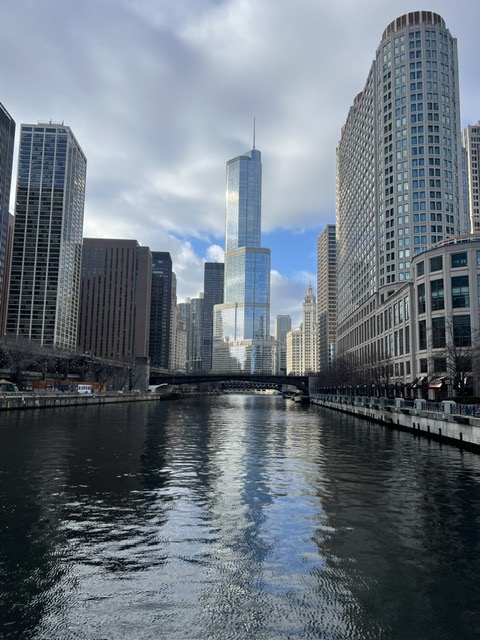 It was our last full day in Chicago. We had a lot planned for the day, so we woke up early to get started. The day before, I had booked a Chicago architecture boat tour that was scheduled to depart at 10 am, but first? Coffee. We took the “L” to the Chicago Riverwalk area and stopped at Mojo Coffee to grab a quick coffee and croissant to-go. The Chicago Riverwalk is a walkable area located along the Chicago River. It features many restaurants, bars, cafes, small parks, tours, and more. During the summer, this area is bustling with people and many outdoor activities. It was 10 am and 19 degrees outside, so it wasn’t so busy when we were there.