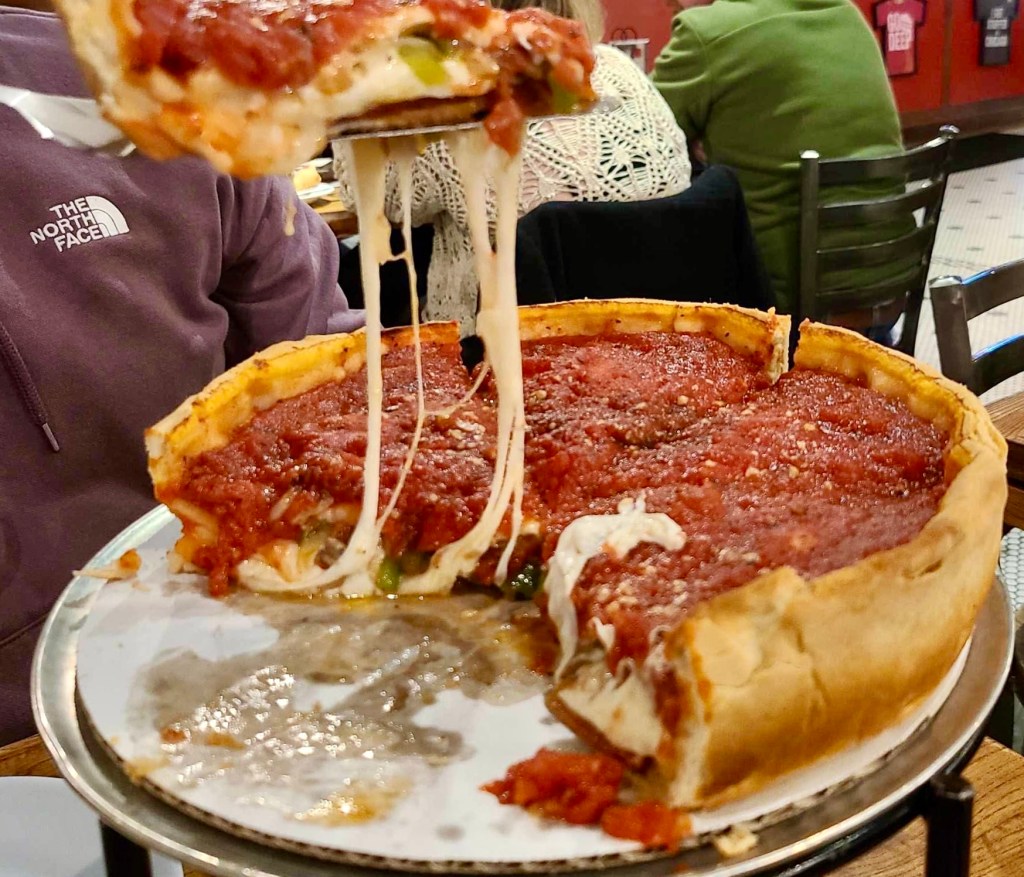 It was dinner time again and one thing we still hadn’t eaten on our trip was the famous deep-dish Chicago-style pizza. We were told by a couple of Chicagoans that deep-dish pizza is a tourist thing, but then again, I’m a tourist, and you can only get deep-dish pizza in Chicago, so we took a short trip on the “L” to Giordano’s. Giordano’s is a famous Chicago pizzeria, serving deep-dish pizza since 1974. Deep-dish pizza is exactly what it sounds like, a deep-dish pizza, but the twist is that the toppings are reversed. The thick deep-dish crust, which is very reminiscent of a pie crust, is first filled with tons of cheese, then your chosen toppings, and finally topped with marinara sauce.